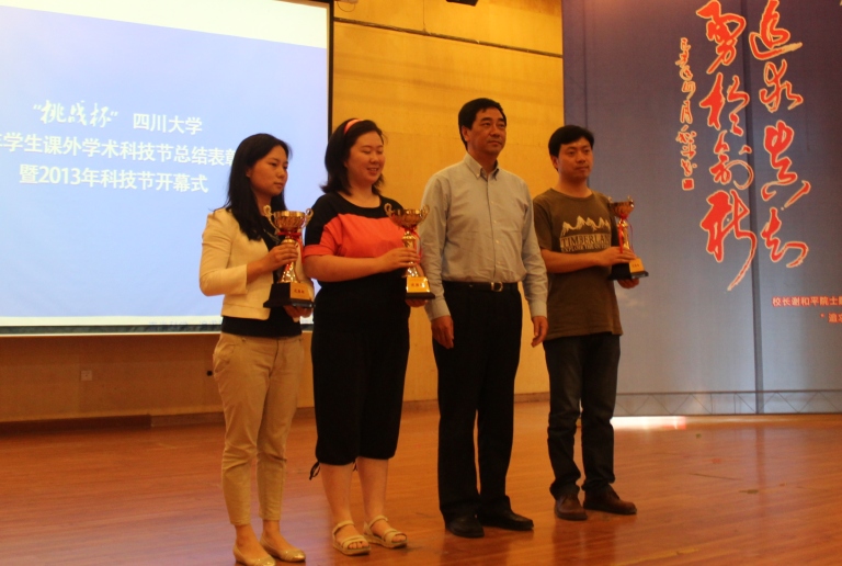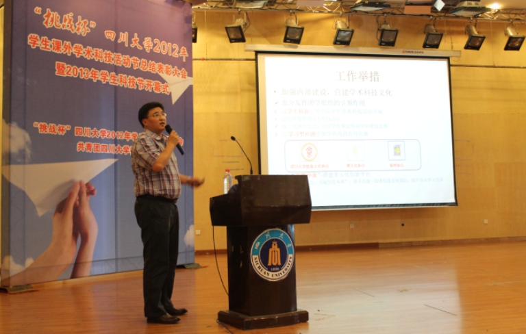 2012年学生课外学术科技活动节总结表彰大会暨2013年学生科技节开幕式在望江校区文华活动中心二楼音乐厅举行。校长谢和平院士,常务副校长李光宪教授,党委副书记李向成教授等领导出席了本次会议。轻纺与食品学院在2012年学生科技节中以总分第六名的优异成绩喜获团体三等奖,院党委副书记刘晓虎副教授作为学院团体获奖代表做工作交流,院团委书记苏德强老师代表学院上台领奖。大会伊始,校团委书记王斌副教授介绍了2012年学生科技节的开展情况和所取得的丰硕成果,校党委副书记李向成教授宣读了《关于表彰在“挑战杯”奈菲影视