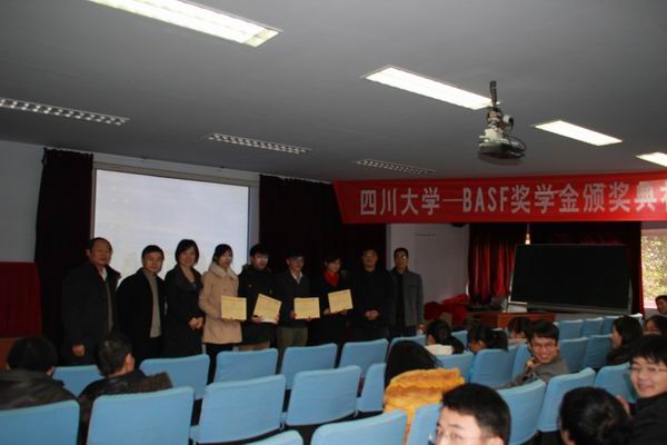 —BASF奖学金获奖名单,到场的各位领导与嘉宾为获奖同学一一颁奖。最后2009级轻化工程专业章培坤同学作为获奖学生代表发言。 颁奖典礼结束后,丁维维博士还为同学们作了“职业发展及规划”的主题讲座,并就同学们所关心的就业与职业选择问题进行了深入交流。同时,公司还进行了BASF成长培训生、博士生招聘、工业夏令营的面试工作。