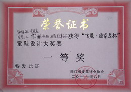 2011年 9月,由浙江省皮革协会主办、台州飞鹰鞋业有限公司承办的“飞鹰·独家龙”童鞋设计大奖赛落下帷幕。大奖赛的宗旨是面向社会,重点鼓励各大专业院校在校学生积极踊跃参赛、同时邀请国内童鞋生产企业、设计单位参赛,为浙江省乃至全国童鞋市场注入新的活力。