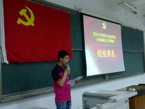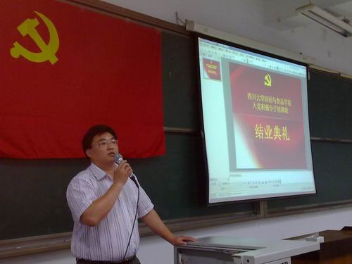 2011年5月20日晚,轻纺与食品学院第130期入党积极分子培训班结业典礼在江安校区综C307教室顺利举行。参加本次结业典礼的有轻纺与食品学院党委副书记刘晓虎副教授,学生工作组李慧老师、冯国涛老师、李晓秀老师以及段飞霞老师。结业典礼由冯国涛老师主持。