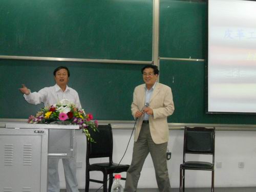 讲学。随后,在大家热烈的掌声中,王全杰教授开始与大家分享他和皮革之间的故事。从西北轻工业学院的一名老师,到创办烟台皮革研究所,再到一名人大代表,王教授走着属于他自己的道路,他也用亲身经历告诉大家“因为喜爱,所以作出了这些成绩”、“要靠自己的努力和命运抗争”。接下来,就每一个皮革系同学所关心的问题—“皮革产业的发展前景”与大家进行了交流。“皮革工业是夕阳产业还是朝阳产业”,每个人对此都有不同的观点,而在王教授看来,“皮革工业是一个日不落产业”。他用大量数据、图表,从皮革产业的可再生性、皮革品的的不可替代性,皮革资源的巨大利用潜力以及皮革工业持续的市场需求等四方面,对他的看法进行了分析。当然,对于发展皮革工业所不能回避的问题—可持续发展,他同时也表达了自己的一些构想和思路,比如说,“推广绿色环保制品”、“深化大皮革思想”等等。最后,王教授还带来自己主持研究的莱卡皮革让大家参观并就大家所关心的话题进行了互动。在一片热烈的掌声中,本次讲座圆满结束。