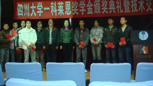 -科莱恩奖学金颁奖典礼暨技术交流活动在皮革楼二楼报告厅隆重举行,参加本次活动的有科莱恩化工(中国)有限公司广州分公司皮革部经理李艳女士;科莱恩化工(中国)有限公司广州分公司皮革部涂饰实验室经理、皮革系96级校友康海生先生;轻纺与食品学院副院长何有节教授;2006级辅导员李晓秀老师。颁奖典礼由院团委副书记冯国涛老师主持。 首先何院长代表轻纺与食品学院生物质与皮革工程系对科莱恩公司两位客人的到来表示热烈的欢迎,对科莱恩公司在我校设立第一个也是目前唯一一个实习奖学金表示忠心的感谢,对获奖同学表示诚挚的祝贺。同时,何院长还详细介绍了科莱恩公司与皮革系的长期合作项目,对科莱恩公司在中国的发展、业务范围进行了详细的介绍。也希望获奖同学不辜负设奖单位的期望,学好技术,增长才能,为报效祖国、汇报行业作出楷模。随后,李艳经理代表公司对奈菲影视