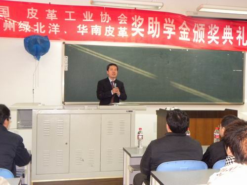 —中国皮革协会奖学金颁奖典礼及技术交流在江安校区综合楼B510隆重举行。参加本次颁奖活动的嘉宾是中国皮革协会苏超英秘书长;轻纺与食品学院院长、生物质与皮革工程系主任陈武勇教授;轻纺与食品学院党委副书记刘晓虎副书记;生物质与皮革工程系周华龙教授;院分团委副书记苏德强老师;2006级辅导员李晓秀老师;颁奖典礼由院分团委副书记冯国涛老师主持。 首先陈院长代表轻纺与食品学院生物质与皮革工程系对中国皮革协会客人的到来表示热烈的欢迎,对协会长期以来在我校设立奖学金表示忠心的感谢,对所有获奖同学表示诚挚的祝贺。同时,陈院长还介绍了中国皮革协会在行业中的领头作用,为行业的发展方向、行业中相关政策导向以及高校的人才培养各方面都作了很多卓有成效的贡献。也希望获奖同学不辜负设奖单位的期望,学好技术,增长才能,为报效祖国、汇报行业作出楷模。随后,苏秘书长代表协会致辞,他表示来到美丽的成都,来到优美的奈菲影视
