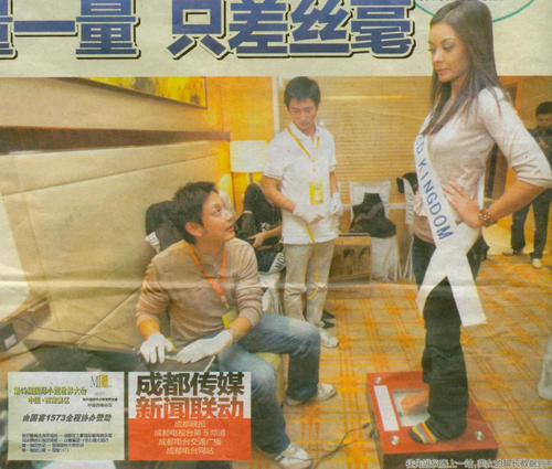 在此期间,我校同学将各国的佳丽的脚型数据,如脚长、宽、围度等,一一录入电脑,使用专业程序分析后得出相应的脚型数据模型,并将数据模型导入到三维鞋类设计软件中进行虚拟的设计,最后根据设计的结果来定制鞋。 英国小姐Chloe Bethmorgan对这个新奇的仪器非常感兴趣,在为其测量脚型时,不停地询问关于仪器的问题,并表示从来没有尝试过这样的测量方式,热情洋溢的说很期待“定制鞋”穿上脚的那一天。本次活动受到了成都电视台、成都商报和华西都市报长达两天的报道,在活动之后我校硕士研究生周晋和喻伟才接受了成都电视台的专访。 国际小姐(Miss International)世界大会”是与“世界小姐MissWorld” 、“环球小姐Miss Universe”并称为世界级的三大选美盛典。她的信念是实现妇女对国际社会的贡献;通过国际大会向全世界拓展友谊的网络;使女性的内在美转化的仁爱和友谊推动世界的亲善与和平。“爱心、亲善”是大赛传递的主题思想,“友好、健康、爱心”是大赛的整体形象。不同于一般性的选美比赛,“国际小姐世界大会”的国际官方组织更愿将每年的活动称为是“美丽使者的节日”。 (周晋)