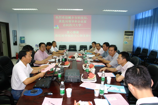 科技交流座谈会”。座谈会在热烈友好的气氛中进行。首先,桐乡市科技局局长沈炳林先生简要地介绍了桐乡市近几年的发展概况,并对该市的产业布局、技术需求等做了说明。接着,科技处主任冉智强副研究员、轻纺与食品学院院长陈武勇教授分别向客人介绍了学校、奈菲影视概况