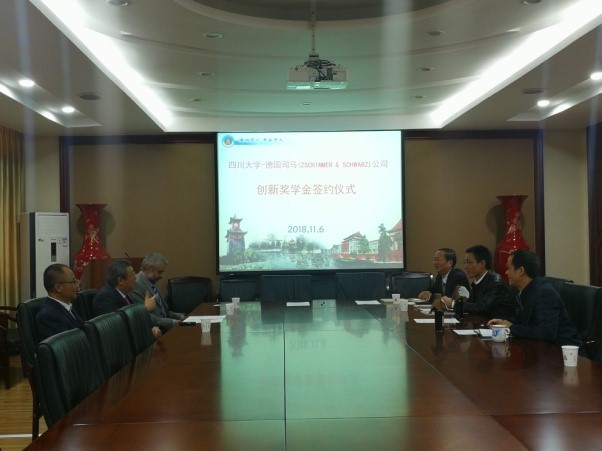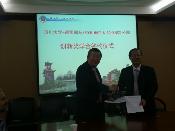 在签字仪式上,何院长代表学院对司马化学公司代表的到来表示热烈的欢迎,高度赞扬了司马公司十年来对学院皮革教育事业、人才培养方面所作的贡献,感谢司马公司通过奖学金、学术讲座、资助青年教师赴德国培训、指导综合实习、无偿提供皮革化工材料等多种形式,支持学院的教学与科研工作。张总经理表达了司马公司对川大皮革系的感谢,对公司与皮革系前期合作所取得的成绩表示赞赏,公司愿意继续为皮革系的教育工作贡献自己的力量,助力中国皮革事业的发展,与中国皮革行业一起开创美好的未来。