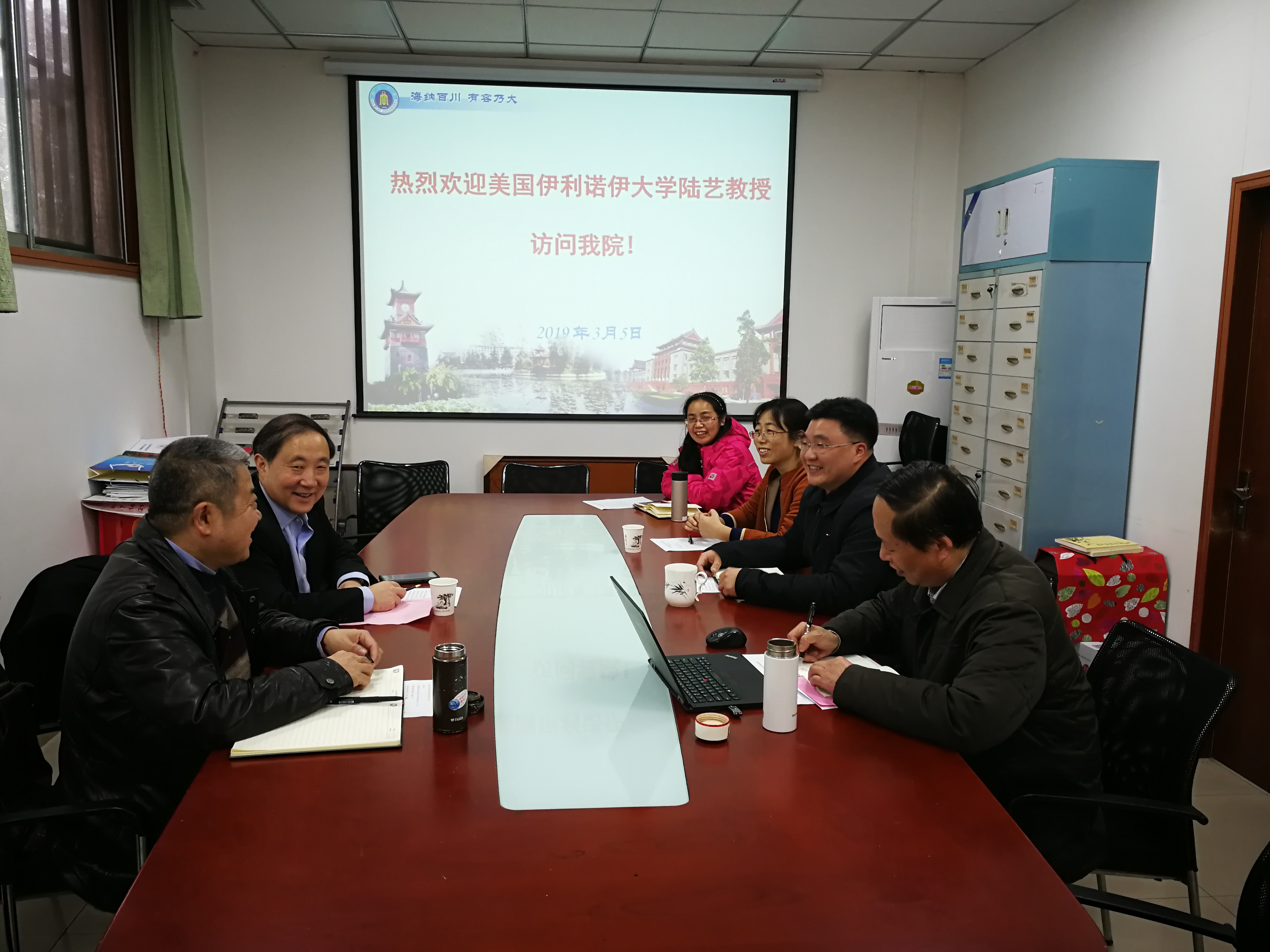 访问交流,刘晓虎书记、何有节院长、但卫华教授、系主任林炜教授、吕远平教授和郭荣辉副教授在纺工附楼201会议室参加了此次交流会谈。