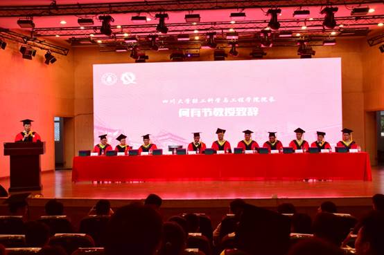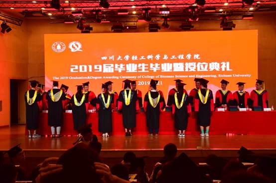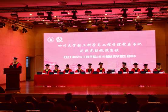 四川大学副校长梁斌教授,轻工科学与工程学院学位评定分委会副主席、副院长何强教授,学院党委书记刘晓虎副教授,学院学位评定分委会委员、教授委员会委员何有节教授、彭必雨教授、单志华教授、朱谱新教授、李国英教授、周荣清教授、金勇教授、阎斌教授出席典礼并在主席台就座。教师代表、校友代表、学生家长代表、学生代表以�2019届全体毕业生参加了典礼。典礼由学院党委副书记冯国涛主持�