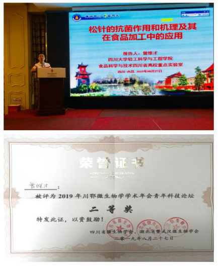 食品工程系曾维才副教授应邀出席大会,并积极参与了微生物资源发掘与利用、微生物与环境保护、微生物与人口健康、微生物与食品安全等方面的科技交流,共同探讨微生物学领域最新科研成果和技术。会议期间,曾维才老师在大会青年科技论坛做了主题为“松针的抗菌作用和机理及其在食品加工中的应用”的科技报告,现场反响热烈,获得了大会组委会授予的“2019年川鄂微生物学学术年会青年科技论坛二等奖”,受到了与会专家的一致好评,积极地扩大了川大食品学科的影响力。