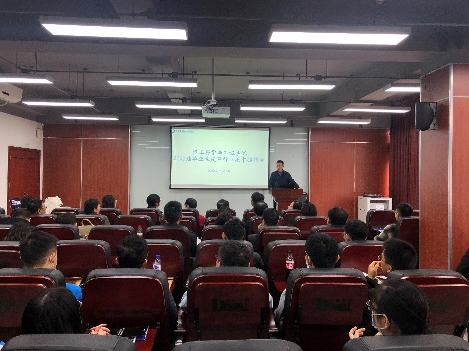 院长何有节教授、党委副书记冯国涛老师、生物质与皮革工程系主任林炜教授、院分团委书记兼就业岗专员李晓秀老师、2017级本科生辅导员王舒灏老师,2021届轻化工程专业和服装与服饰设计专业就业学生参会,集中招聘会由党委副书记冯国涛老师主持。
