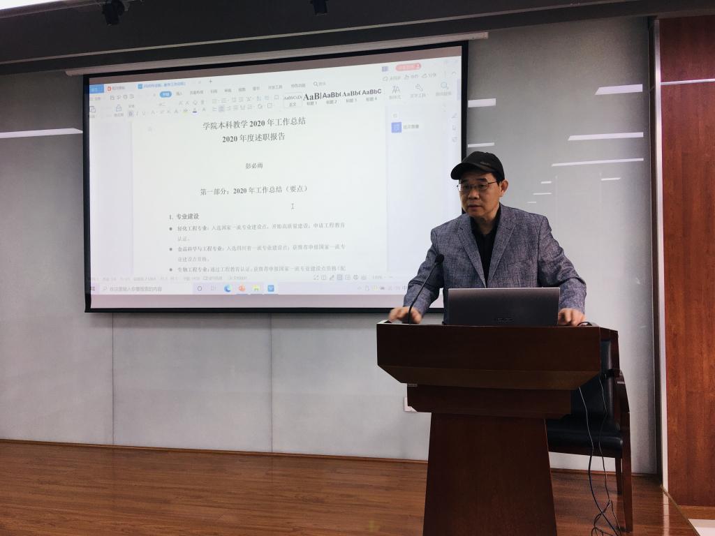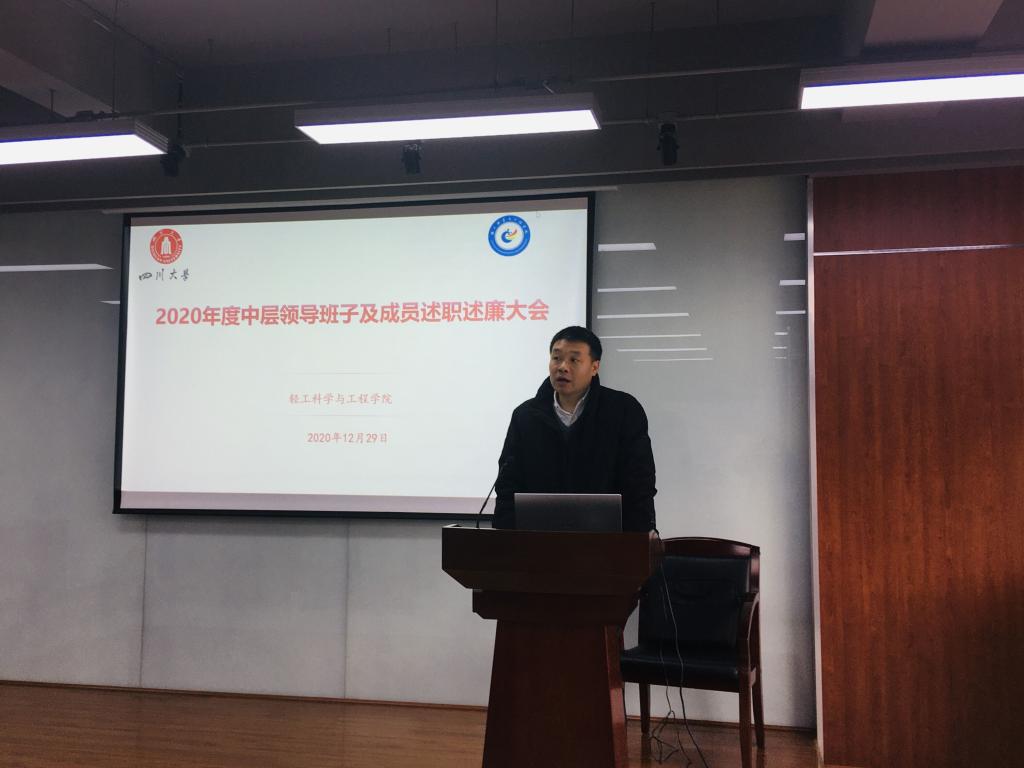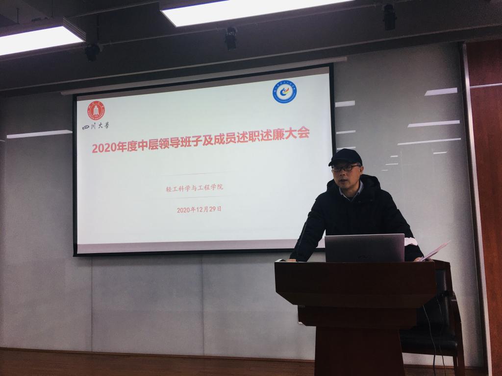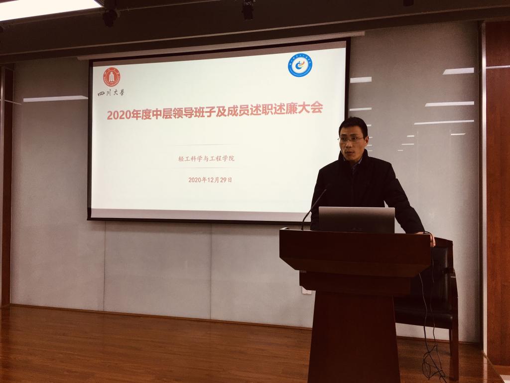 2020�12�9��午,轻工科学与工程学院在皮革�215报告厅,召开学院领导班子及成�2020年度述职述廉暨民�测评大会。大会由学院党委书记刘晓虎主持,全院教职员工参会�