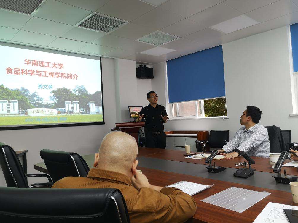 随后,华南理工大学食品科学与工程学院娄文勇副院长从学科专业发展沿革、学科特色、师资力量与学生、科学研究、人才培养、服务社会等方面向与会人员详细介绍了学院情况。娄院长指出食品学科发展前景很大,身处粤港澳大湾区建设中的华南理工必将迎来新的更好更大的发展机遇,希望双方后期能在学科建设、科学研究、人才培养等方面深入合作,全方位加强交流和融合。