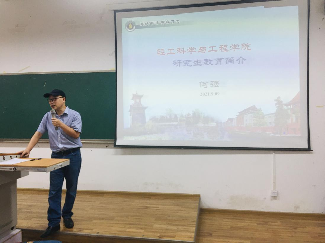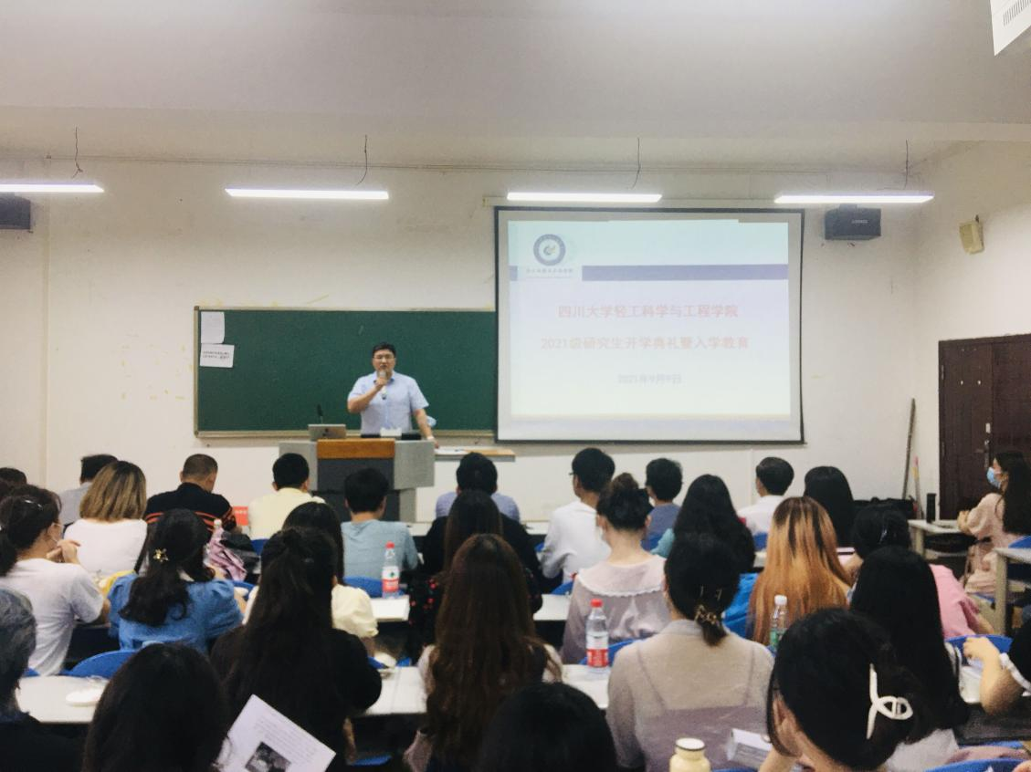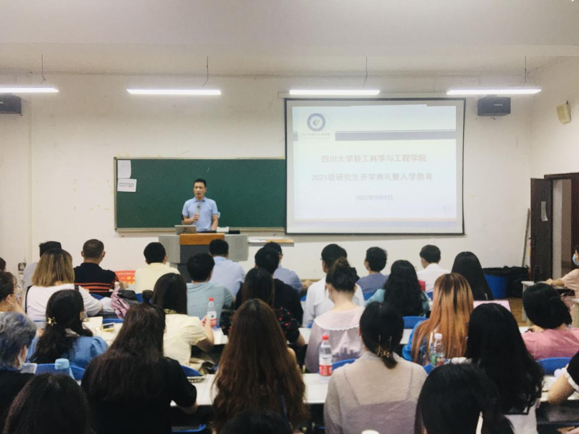 2021�9�9日下午,四川大学轻工科学与工程学�2021级研究生开学典礼暨入学教育在纺工附�205报告厅隆�举行。参加本次开学典礼的有学院党委刘晓虎书记、何有节院长、冯国涛副书记、何强副院长、生物质与皮革工程系副系主任刘公岩教授、食品科学与工程系副系主任迟原龙副教授、纺织与服装工程系副系主任施亦东副教授、研究生教务员徐雅琳老师、党政办李艳老师以及2021级全体研究生新同学。开学典礼由学院党委冯国涛副书记主持�