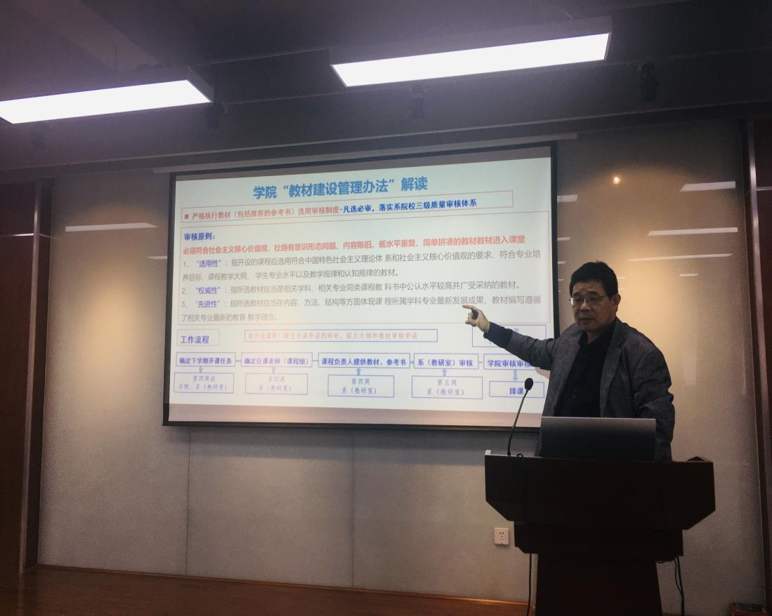 学院教学院长彭必雨教授做了题为“增强底线意识、践行立德树人”的学习教育报告。彭院长围绕高水平教材建设要旨、学校对高水平教材建设的相关要以及教材编审、选用中注意的问题,深入解读了学院制定的“教材建设管理办法”,并就近期主要工作如专业建设、新一轮教学计划修订、金课建设等事项进行工作部署和安排。