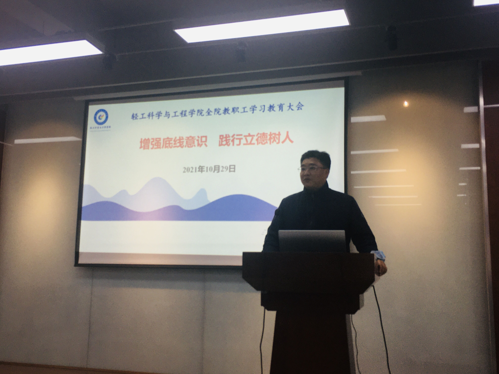 2021年10月29日下午,学院在皮革楼215报告厅召开了全院教职工学习教育大会。全体教职工出席会议;何有节院长主持会议。