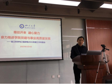 2022�3�4日下午,学院召开以“继往开来、凝心聚力,奋力推进学院党建与事业高质量发展”为主题的全院教职工大会,传达学校“双代会”暨2022年度工作布置会相关内容以及安排部署本年度工作。按疫情防控要求,本次会议采取主会场与分会场相结合的方式召开,学院领导班子、生物质与皮革工程系教师在皮革楼215报告厅主会场参会;食品工程系、服装与服饰设计系、纺研所教师以及学院公共服务体系教师分别在纺工附�205会议室与皮革�209会议室两个分会场参会。本次会议由李天富书记主持�