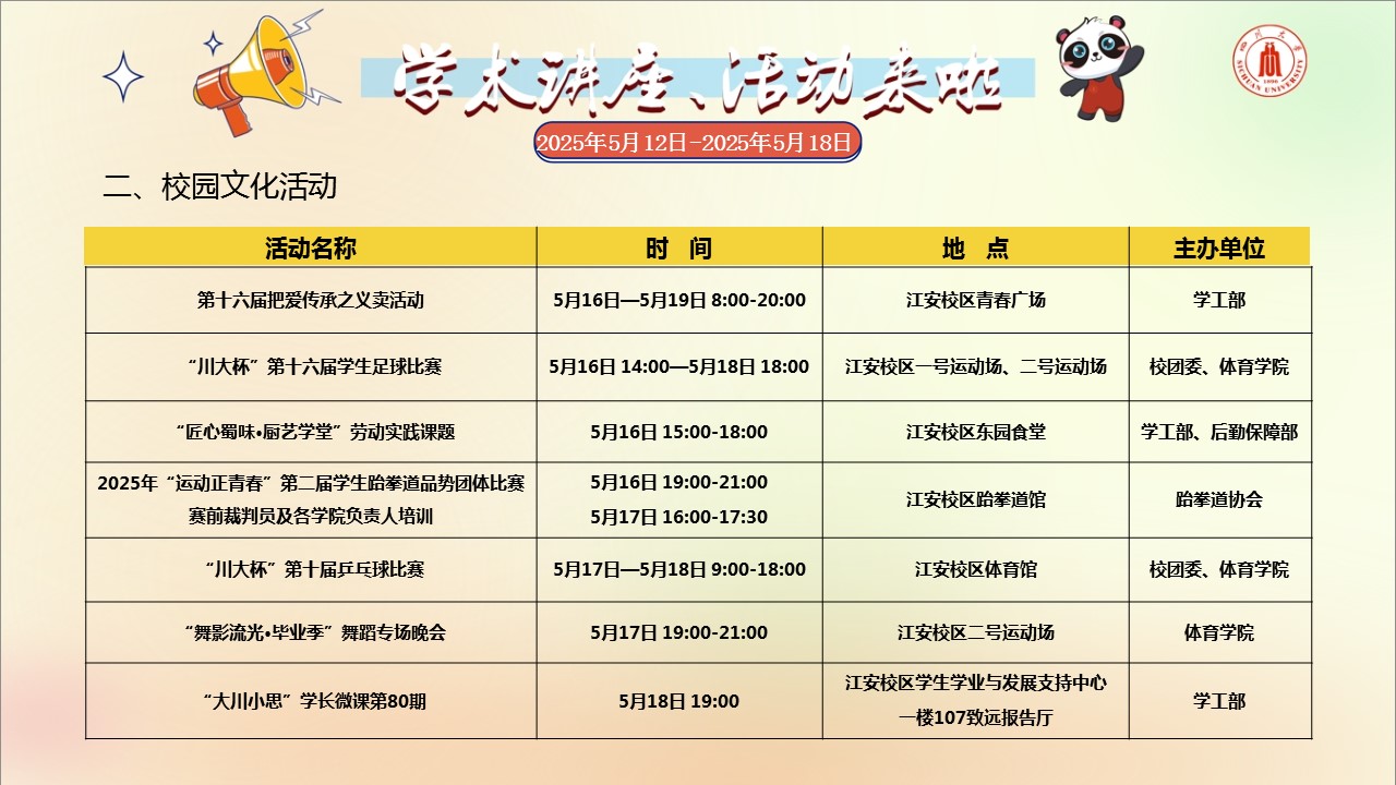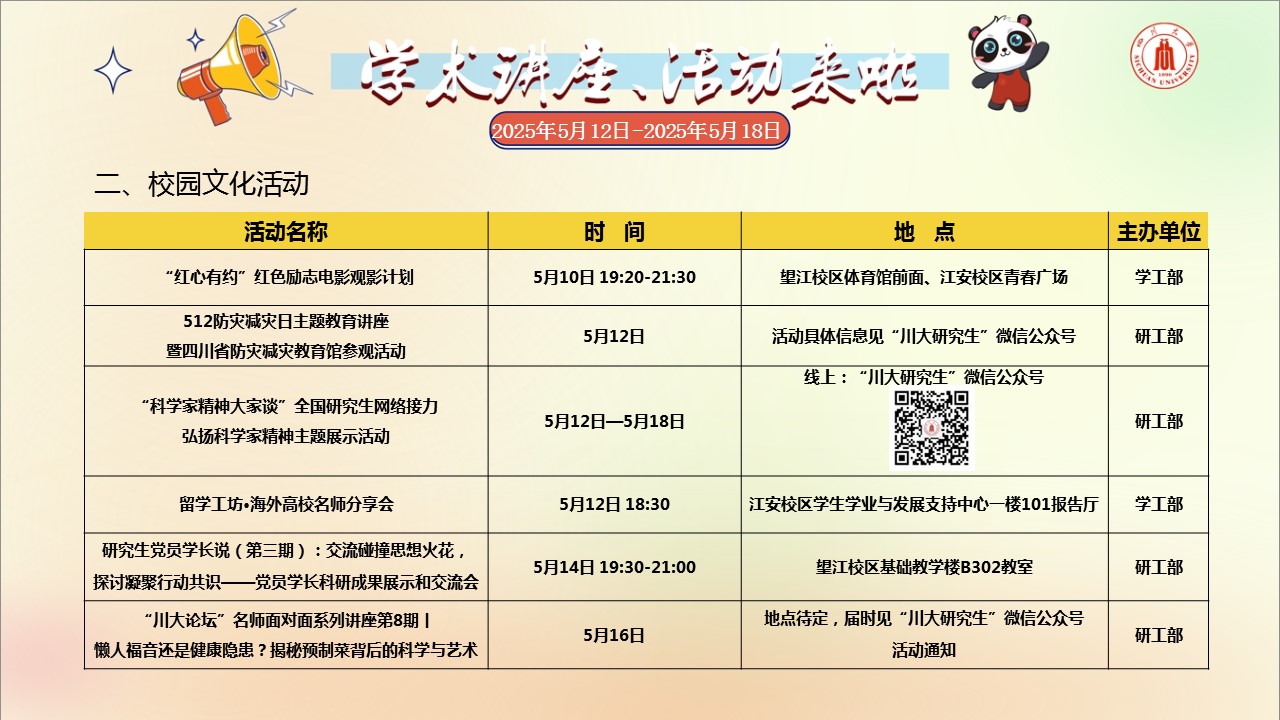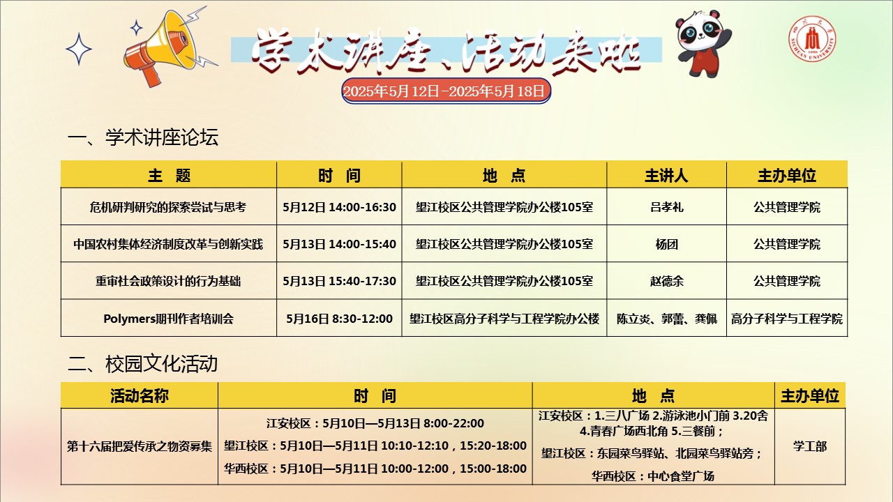学术讲座论坛及校园文化活动预告(2025年5月12日-2025年5月18日)