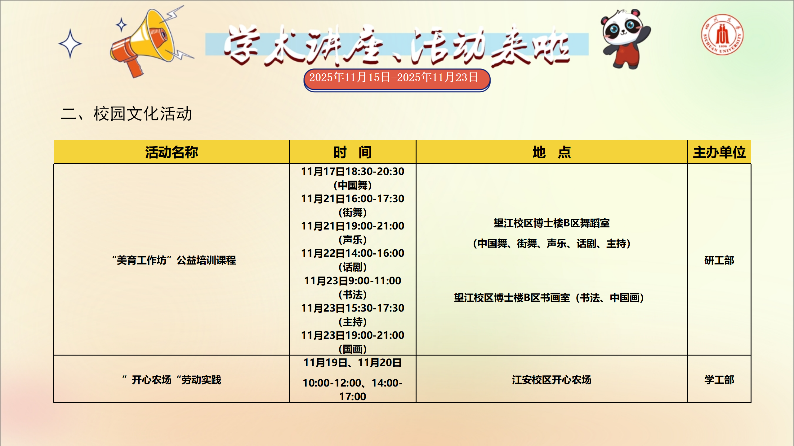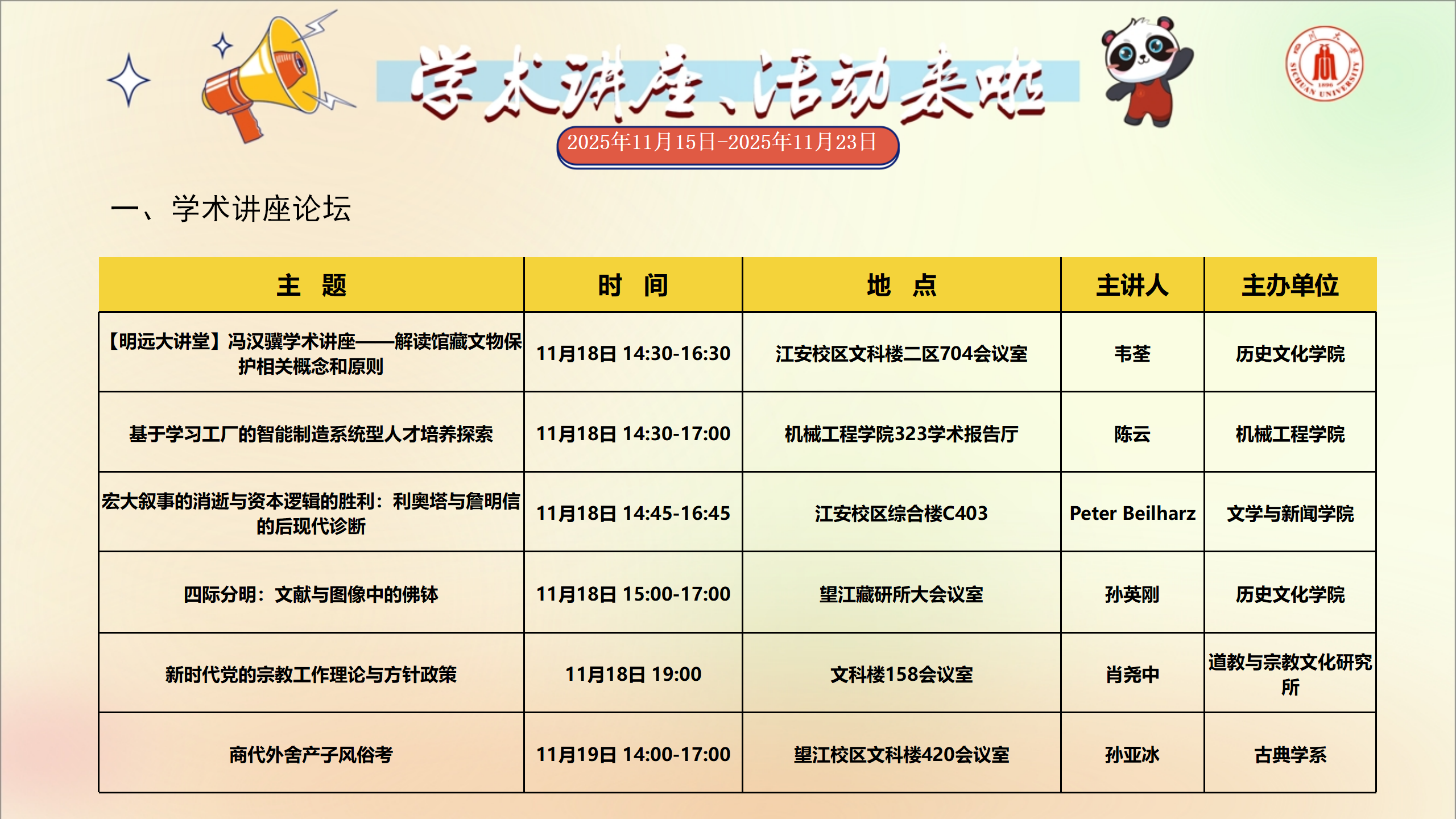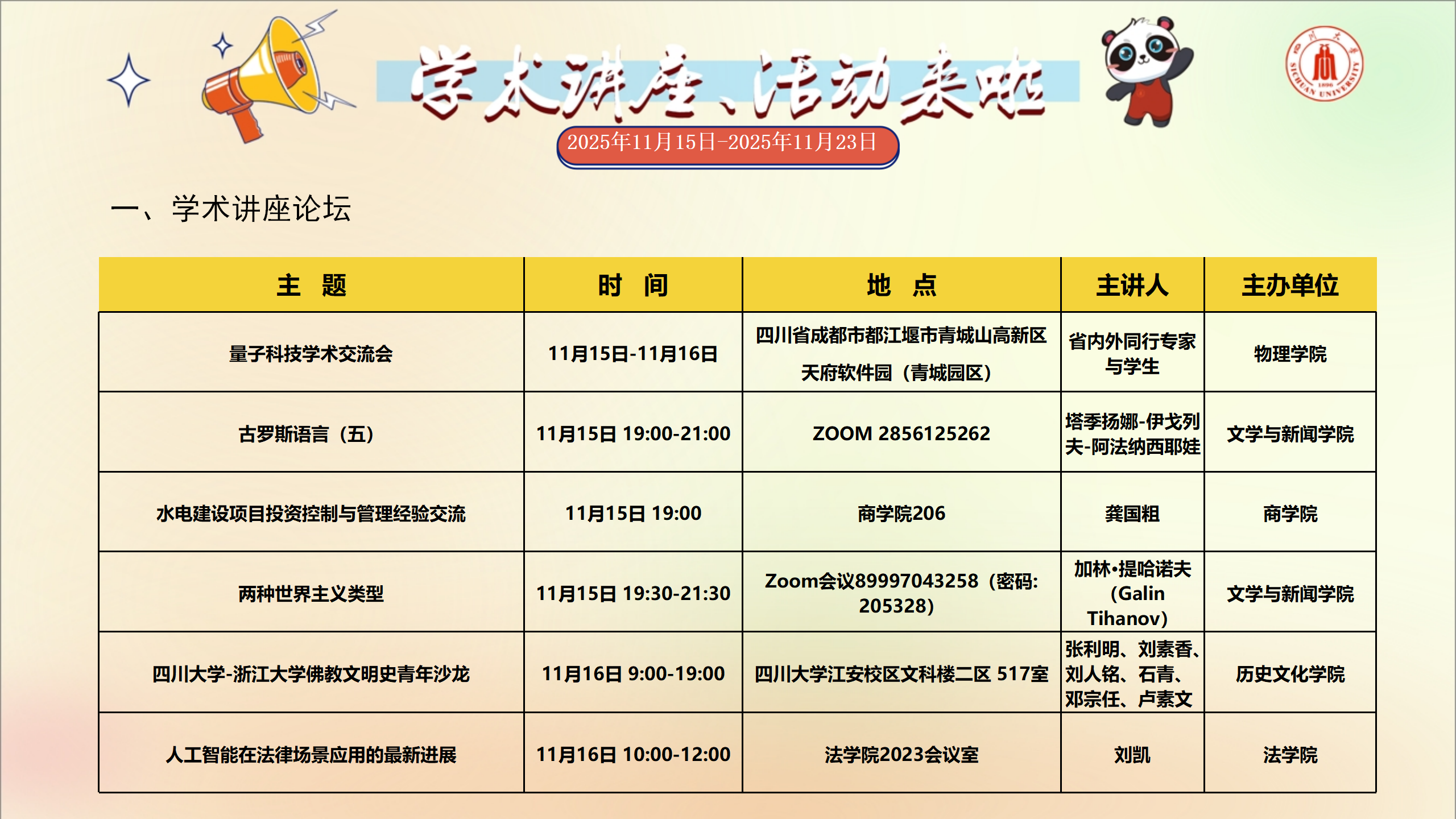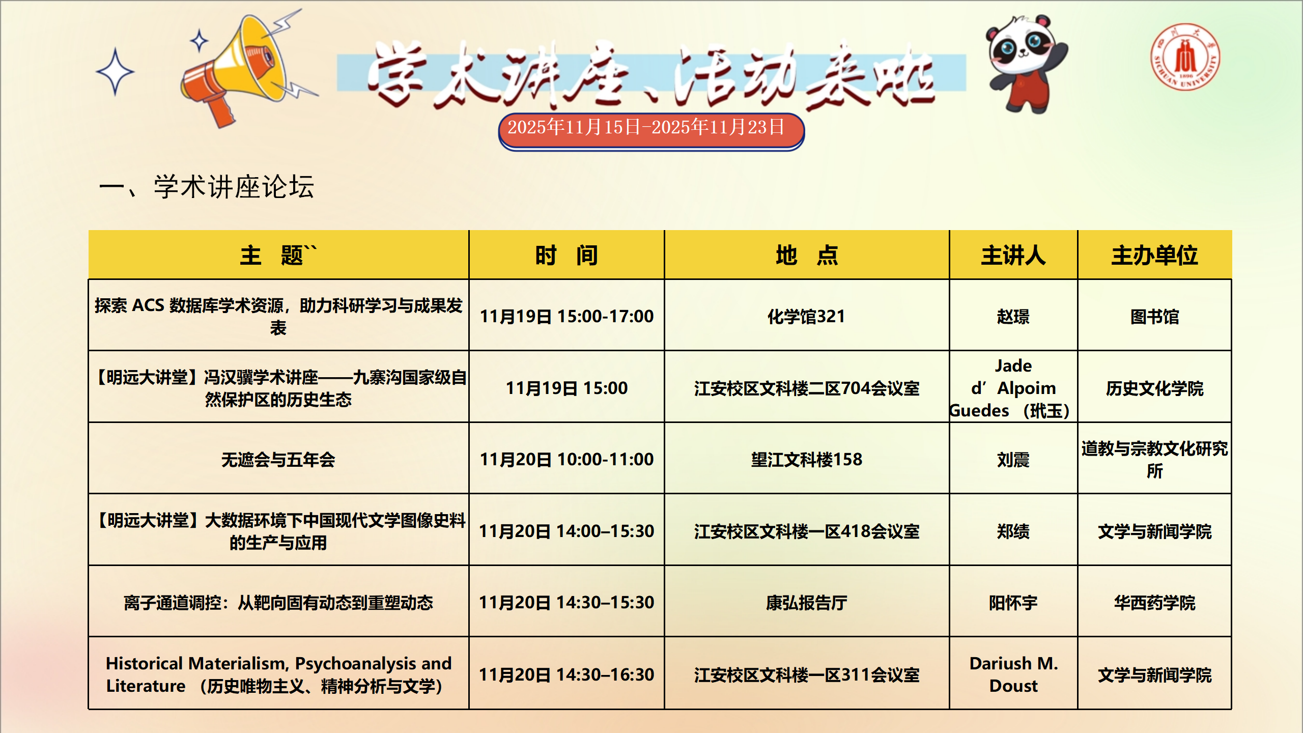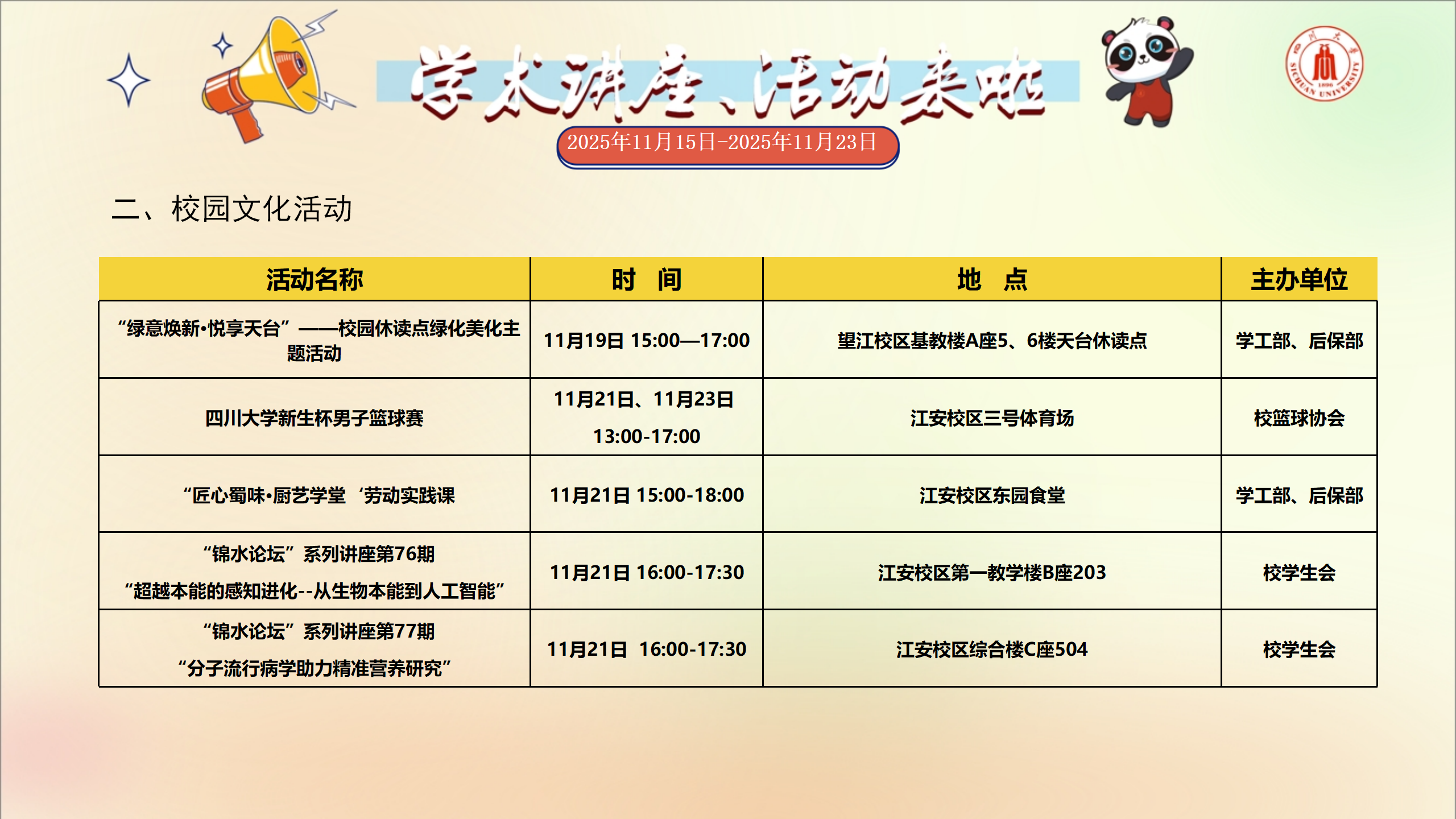 学术讲座和校园文化活动预告(2025年11月15日-2025年11月23日)