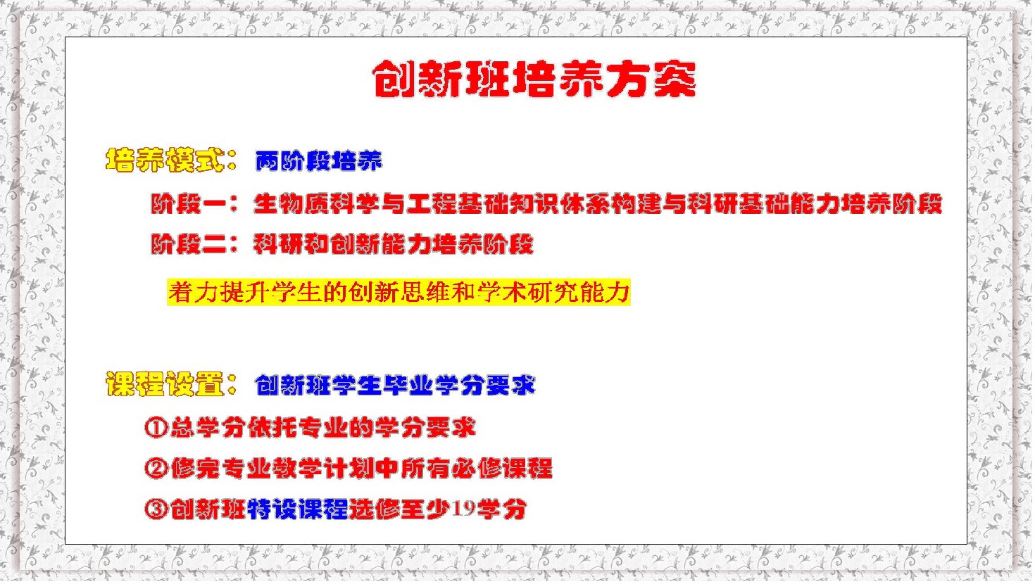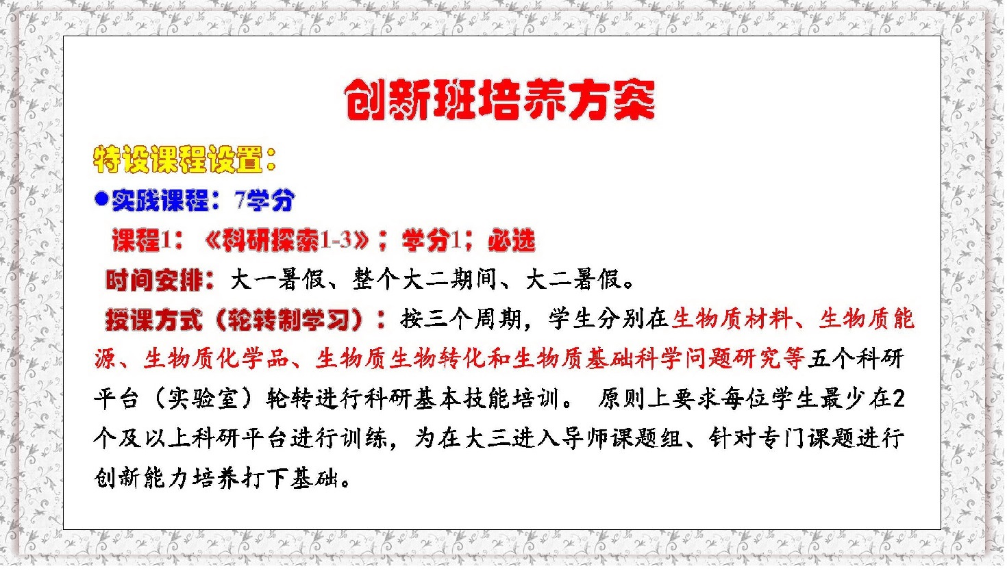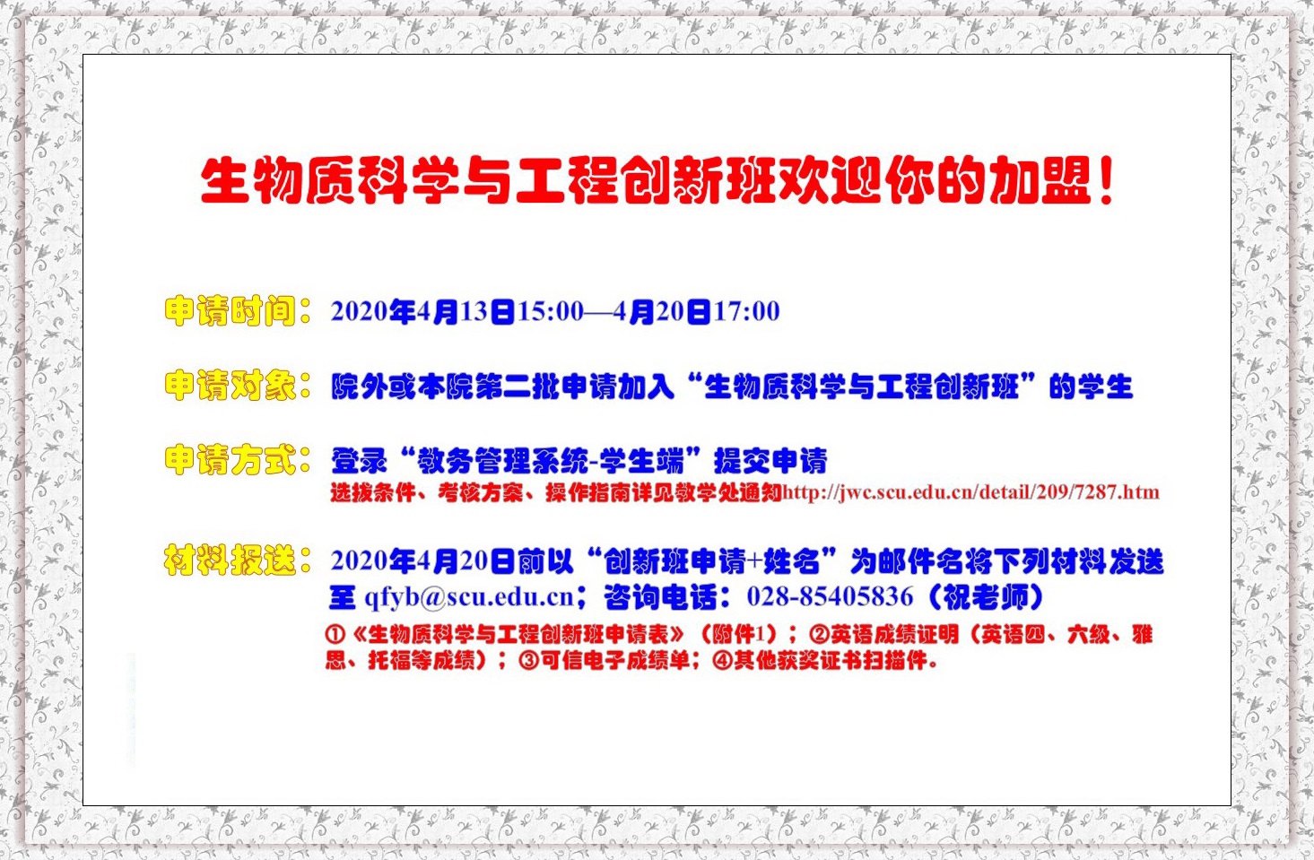 一、生物质科学与工程创新班2020�选拔条件、考核方案、操作指南详见教学处通知。(点击去往�