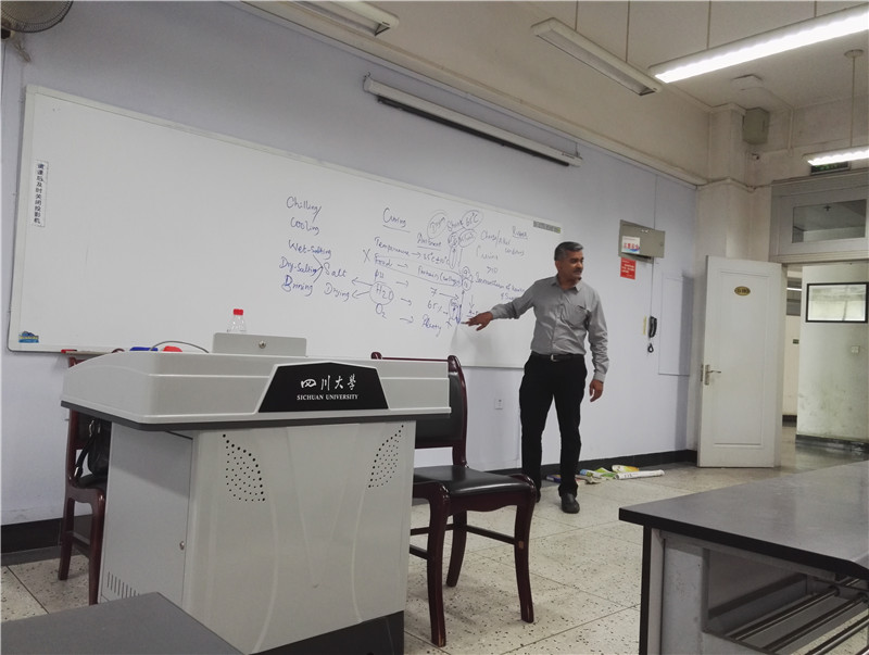 江安校区一教D103教室给选课的本科生首先简单介绍了自己以及主要研究方向和本课程主要内容。在确认自己的语速能保证同学们听懂后,了解了同学们的专业基础。在课堂上,Thanik强调“What”“How”和“Why”,注重提高同学们的逻辑思维能力,从简单的问题出发,循循善诱,启发大家思考,激发同学们的学习热情、鼓励大家大胆表达;对同学们的十分关心的清洁化制革方法、动物保护等问题,认真倾听并结合自己多年的研究成果和教学经验进行了仔细的讲解。Thanik教授严谨的科学思维和注重启发思考的教学方式给同学们留下了深刻的印象。据悉,此次川大行将持续至7月15日。在此期间,Thanik教授还会继续介绍鞣前工段的理论和机理以及原料皮蛋白质理论和鞣制机理。通过此次“实践与国际课程周“活动,奈菲影视轻化工程专业的本科生对原料皮的保存理论和机理有了更清晰的认识,对保存方法有了更深刻的记忆。与此同时,在Thanik的引导下,同学们敢于并乐于表达,扩充了专业知识并且提高了专业英语应用水平,促进大家积极思考,以机理为出发点更好地理解制革中的一些问题。