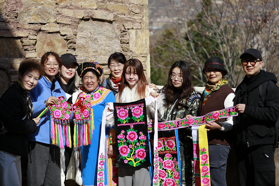在古羌城内,还坐落着茂县非物质文化遗产传习中心,这里聚集了传统技艺、传统音乐、传统体育竞技游艺、传统医药、民间文学、民间美术等多种门类的非遗项目。通过邀请相关非遗项目传承人进驻传习中心,形成了一个集非遗展示、传习、体验、销售于一体的文化景点,让观众近距离感受羌族非遗的魅力。赵敏副教授邀请了国家级非物质文化遗产项目羌绣传承人李兴秀女士进行对话交流,帮助师生进一步了解羌绣文化。据介绍,羌绣色彩突出、图案多样、做工精巧,技艺上吸收了多种刺绣工艺,风格方面充满了民族审美品味。如今的羌绣,不但实现了非遗技艺的活态传承,还形成了产业,成为羌族女性创业增收的一个风口。对话过后,与会师生针对羌族元素配色、风俗禁忌等话题进行了进一步探讨。面对活态传承与设计转化难题,李兴秀大师既有基于自身经验的周到讲解,也用实物作品向师生们进行了针对性答疑�