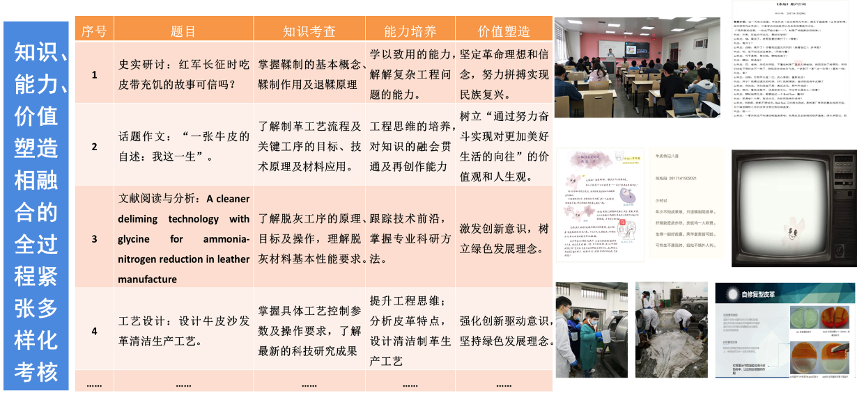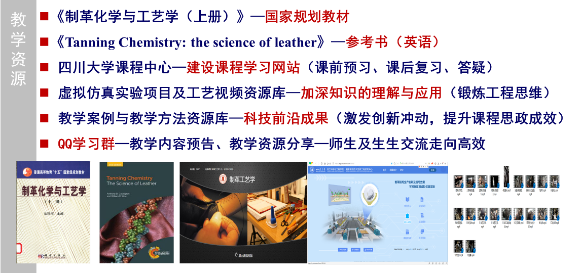 开展课程教学内容的系统重构。将科技前沿成果融入课程。针对知识更新滞后的问题,建设以行业科技发展的新理论、新技术为主的教学案例库,提升教学内容的前沿性和时代性。积极利用现代信息手段丰富课程教学资源,先后建成了《制革工艺学》线上课程平台;《制革脱毛生产实训及脱毛效果可视化监测虚拟仿真实验项目》;可视化制革工艺教学视频库等。经过多年的发展,已经建成了以国家规划教材为基础的、虚实结合、线上线下融合的教学资源体系;为丰富教学方法奠定了基础,并为提高学生对工程认知提供了工具�
