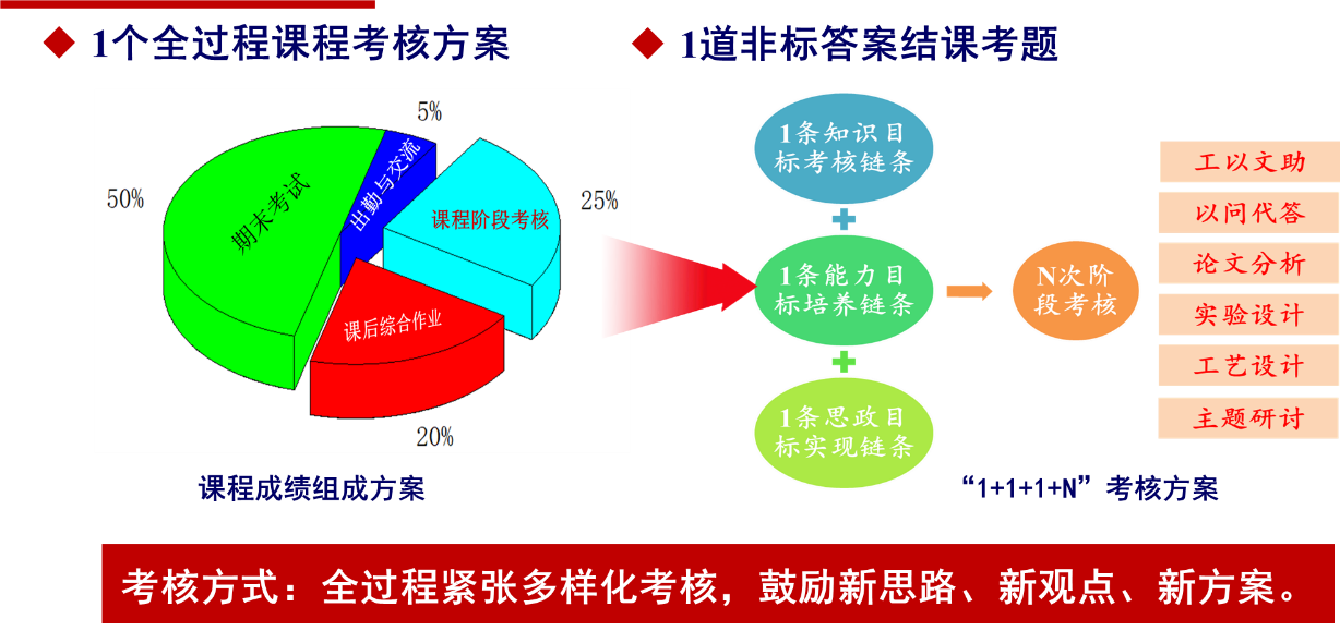 针对考核方法单一、产出标准不严等问题,系统优化学习评价方法,从一考定终身的传统期末考试,拓展到自主学习、持续学习和适应发展的全过程考核,初步形成了1+1+N”的全过程课程考核方案设计原则。在过程性考核中,设计了比较多的非标准答案主观性考题,特别注重知识、能力、价值导向的融合考查,提高课程的挑战度�
