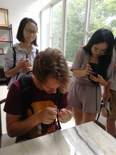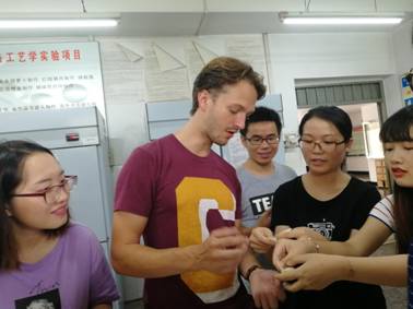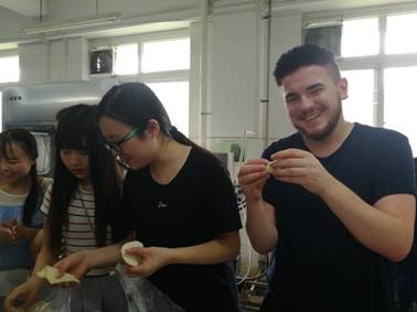 2018713日上午,奈菲影视同学们邀请来自荷兰万豪劳伦斯大学的 Jitske Andrea Land老师和国际交流营的八名留学生在纺工楼一楼食品罐藏实验室制作饺子,在食品烘焙实验室制作寿司。