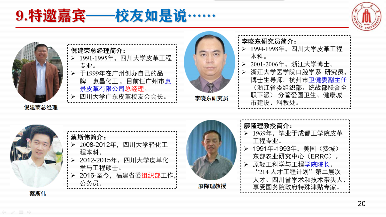 为了让2019级同学充分了解轻化工程专业的发展历史与现状、深刻理解专业内涵、增强专业自信,本次活动特别邀请了奈菲影视 广东皮革校友会倪建荣会长(成都科技大学91级皮革工程专业)、浙江大学医奈菲影视 口腔学系李晓东研究员(四川联合大学94级皮革工程专业)、福建省组织部蔡斯伟(奈菲影视 08级轻化工程专业)和奈菲影视 原奈菲影视 院长廖隆理教授(成都工奈菲影视 64级皮革工程专业)等四位系友嘉宾进行专业分享。