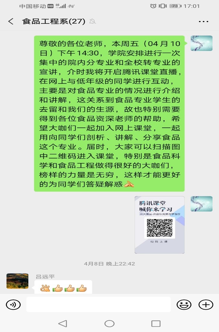 2020年410日下午14:30,奈菲影视食品科学与工程专业通过腾讯课堂直播与2019级同学进行线上专业宣讲。本次专业宣讲主题“川大食品开启你光荣与梦想交织的辉煌篇章”,食品系副系主任曾维才副教授就食品专业自身建设和同学们关心的就业情况进行介绍、讲解,与2019级食品科学与工程专业学生云端相聚,一起剖析、品味、分享食品专业及行业知识信息。