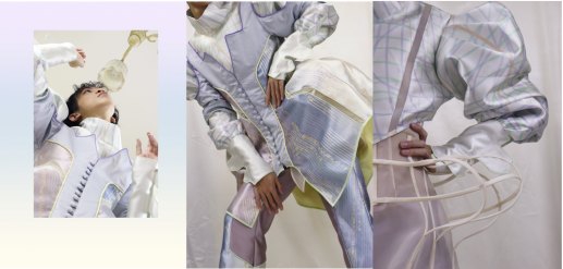 2作品主题为《Projective Ego(投射自我)》,创作是从前期灵感调研延伸而来的曲面空间关系,以镂空拼接、滚绳等工艺来创造服装的立体感和透气感,大量运用了平面制版和立体裁剪相结合的方式来塑造服装的廓形。每套服装的制作,都通过初期坯样、通过平裁/立裁来实验,选择最佳的方式尽可能还原效果图;同时选用了不同的面料来实验,选择最佳的效果;中后期模特试穿、调整修改、二轮样衣的过程逐渐修改确定到最终版型