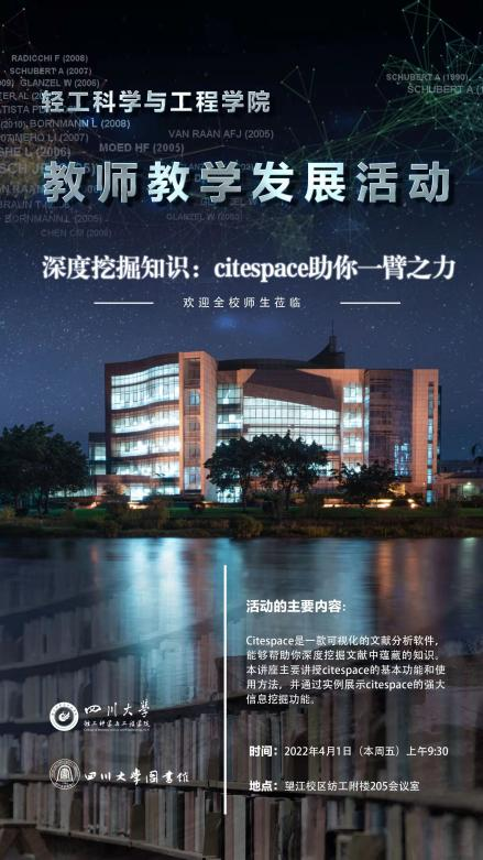 为进一�提升师生信息素养我院再次邀请四川大学图书馆王圣洁老师和魏丽敏老师,于202241日在四川大学望江校区纺工附楼205会议室开展了主题�深度挖掘知识�CiteSpace助你一臂之�的教师教学发展系列活动。参加本次活动的主要人员有服装与服饰设计系系主任杨璐铭教授、副系主任申鸿副教授、轻工生物技术教研室主任金垚副教授等四十余位学院教师及学生�