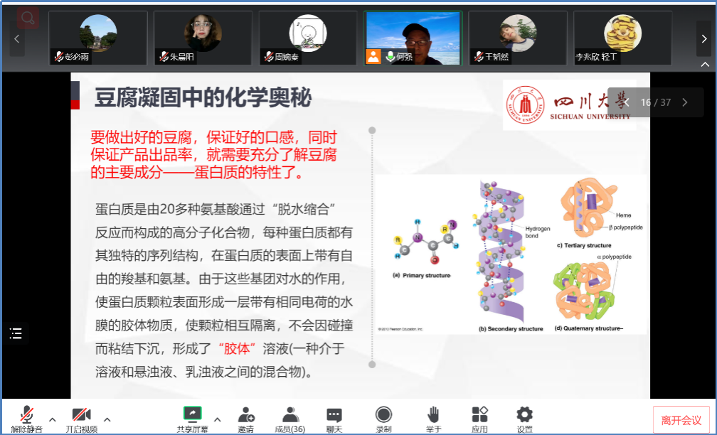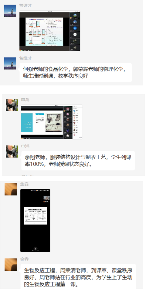 从检查情况来看,学院线上教学秩序总体良好,任课老师采用多种形式的教学手段进行有效互动,学生参与度高。如:何强教授的《食品化学》课程,设置“联席主持人”,协助任课老师进行线上教学准备与学生到课情况检查;周荣清教授的《生物反应工程》课程,到课�100%,课堂秩序良好,周教授站在行业的高度,为学生上了生动的生物反应工程第一课,有利于引导学生的学习兴趣和对专业的热爱;迟原龙副教授的《食品微生物学》课程,采用线上签到,学生到课率高、教学秩序良好,观看短视频增加学生对知识的感性认知,教师通过课堂提问与学生进行互动;时昱老师的《时装作品集制作》老师设计的问题很巧妙,与学生互动良好,课堂气氛活跃等�