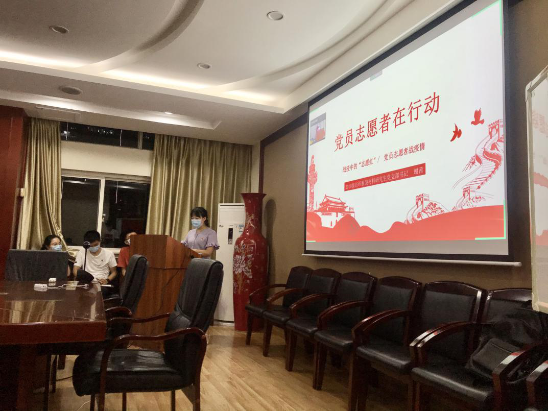 2019级纺织服装研究生党支部书记谢茜同志分享了疫情期间自己作为党员志愿者在行动的经历感受,介绍了该支部党员志愿者在社区、加油站、交通枢纽点等开展志愿活动情况,向与会党员展示了在这场严峻的战“疫”中,广大青年党员志愿者挺身而出,用自己的实际行动展现出青年一代的责任与担当,汇聚起战胜疫情的强大青春力量�
