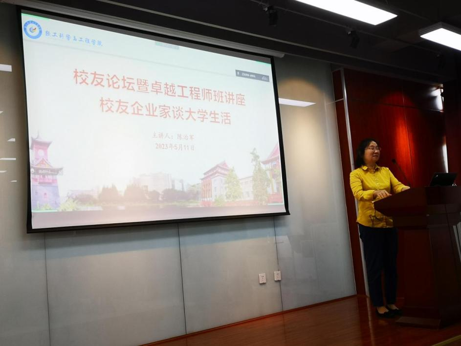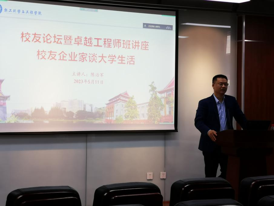 2023�5�11日下�15:00,轻化工程专�2019级卓越工程师班创新创业系列讲座在皮革�215报告厅拉开帷幕。鸿丰高分子材料有限公司总经理陈志军为同学们做了《校友企业家谈校园生活》讲座� 2019级卓越工程师班本科生、学院党支部副书记冯国涛副教授�2020级辅导员�玲老师、任课教师何有节教授以及戴红副教授出席了本次讲座开讲仪式�