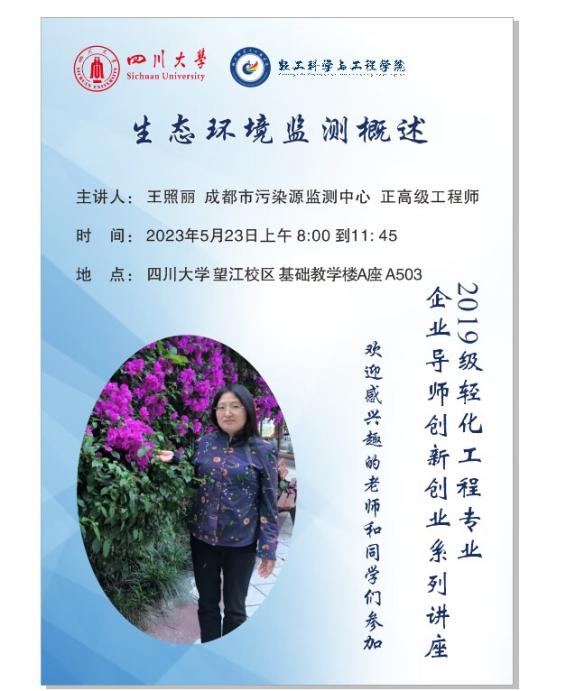 2023�5�23日上�8:00�11:45� 在四川大学望江校区基础教学楼A座A503室,成都市污染源监测中心王照丽高级工程师为学生们做了“生态环境监测概述”的专题讲座。通过该讲座,学生们掌握了环境监测的目的、水环境质量的类别,明确了环境监测未来的重点发展方向。通过学习《制革及毛皮加工工业水污染物排放标准》(GB30486-2013)出台背景以及出台后对制革工业发展的影响,同学们对行业有了全新的认识,更加坚定了制革行业绿色发展的决心�