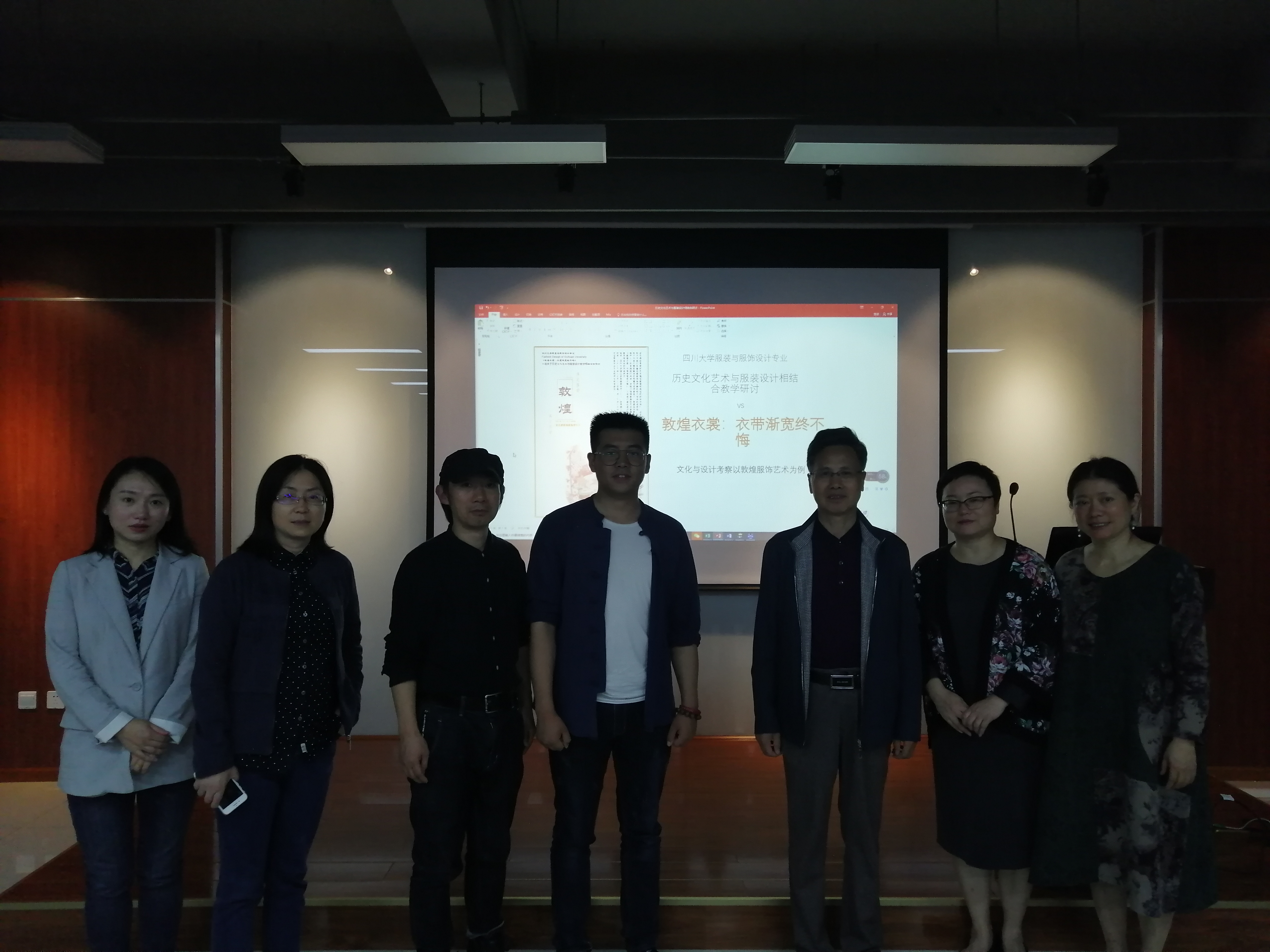 校督导组的傅师申老师也特意来到我们中间,表明了学校对基层教学交流活动的重视。参与教学研讨的师生包括教研室负责人赵武、冯洁老师,专业课教师周怡、吴晶、李晓蓉、吴芳、曾琦老师等,参与研讨的学生以今年5月到敦煌采风的大四学生为主,他们对敦煌有着美好的记忆,也有来自江安的大一的新生。研讨会特别邀请了被敦煌魅力感染,敦煌归来激发了创作热情以敦煌印象为主题设计制作了系列服装的武子涵同学,与我们交流她的创作。现场关于敦煌艺术及相关问题、在服装教学中如何引导学生创作,老师与同学之间,以及与来自敦煌研究院的邢耀龙交流热烈气氛良好有不错的效果。