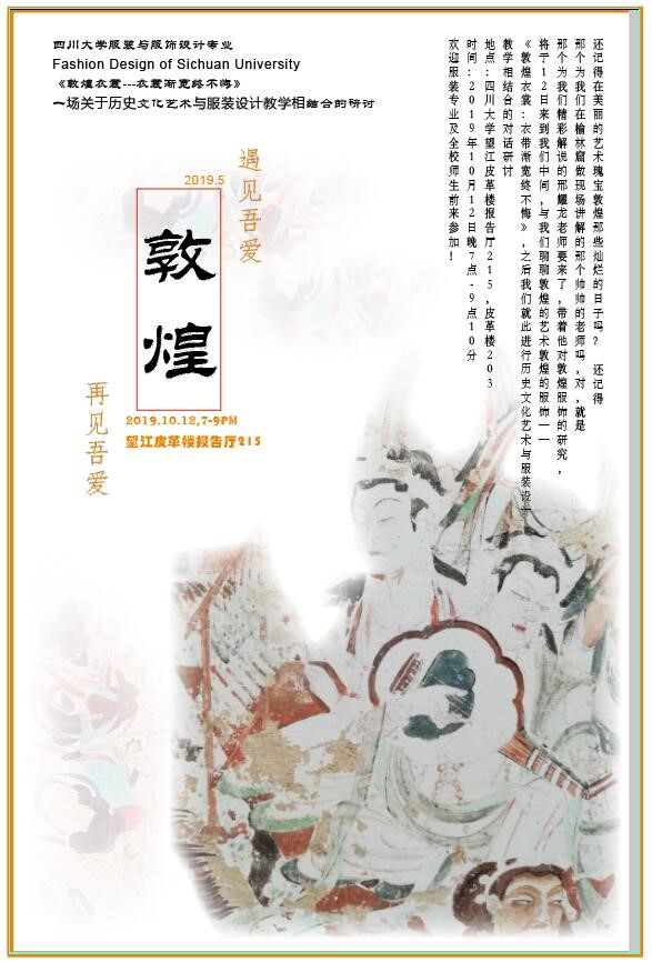 在今年春夏之季5月初,带着教学任务的服装专业师生来到敦煌地区进行历史文化与艺术的考察,走访了榆林窟、莫高窟、西千佛洞、酒泉市黄泥堡裕固族乡等地的历史遗迹与民族服饰文化,在榆林石窟有缘结识了来自敦煌研究院邢耀龙,他对敦煌历史文化艺术的学识认知与生动的讲解感染了大家,在石窟中的讲解时间有限,为提高服装专业学生对敦煌历史与服饰文化艺术更深入的了解,深入将历史文化与服装设计教学有机生动的结合, 在金秋10月国庆后我们邀请了邢耀龙走进校园,为我们带来敦煌服饰相关的专题讲座《敦煌衣裳:衣带渐宽终不悔》,同时与我们服装专业师生一起进行了一场关于历史文化艺术与服装设计相结合的教学研讨。