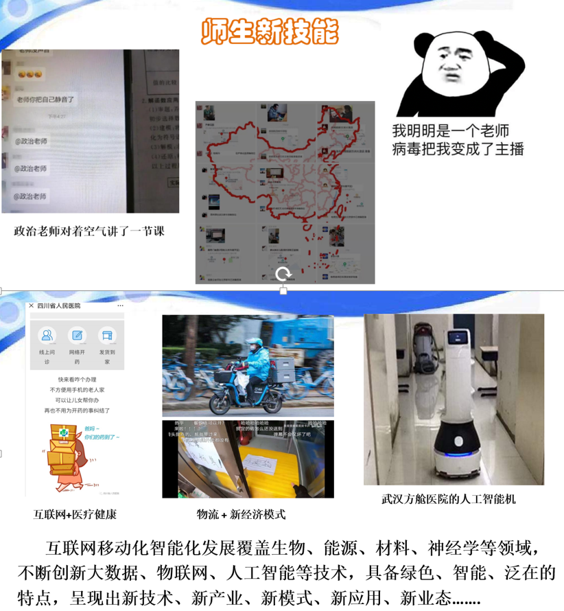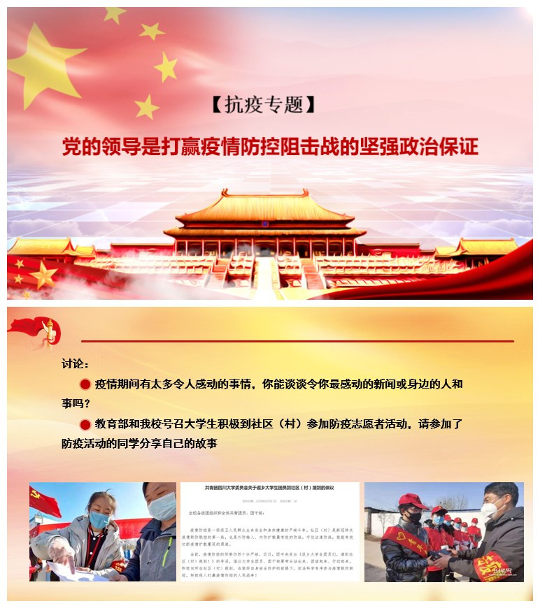 疫情防控的实际情况,本次课程加入了抗疫主题内容——党的领导是打赢疫情防控阻击战的坚强政治保证。主题讲解中邀请武汉同学分享疫情期间的亲身体验和感触,并引入在线同学的讨论,意在让同学们更为直观的了解疫情,特别是处在疫情暴风眼的武汉的情况,从而从党的领导、社会治理、民生、人性等多方面去看待疫情。