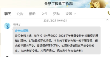 本科教务员将不能按时返校的学生信息发送给相关课程老师,提醒老师做好相关学生的线上教学安排。