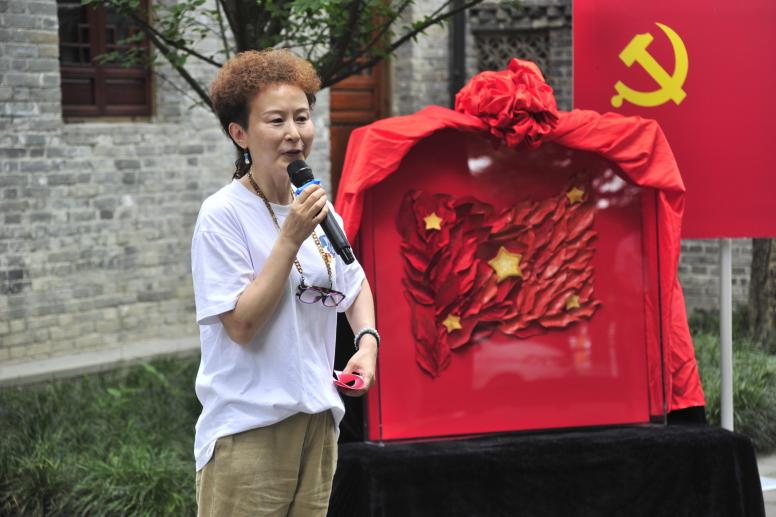 随后,成都市非物质文化遗产保护中心科技宣传科陈爱蓉科长致辞,她指出,本次捐赠活动具有创新性、代表性、前瞻性。《“秀”红旗》作品表达了年轻一代党员对革命精神的全新解读,符合新时代党对青年党员的要求。该作品�皮革材料与“非遗”蜀绣技艺在皮革装置艺术作品中的首次跨界碰撞,让皮革材料与“非遗”蜀绣技�成为传承红色基因与中华文化的载体�未来可期�