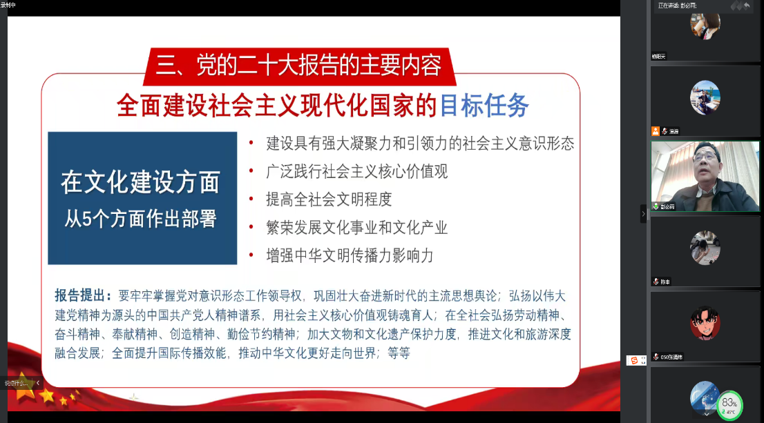 首先,彭必雨院长从党的二十大重要意义、重要任务、党的二十大报告主要内容三方面向同学们全面介绍了党的二十精神,并对国家在科教人才方面四个部署进行重点解读。党的二十大报告指出,教育、科技、人才是全面建设社会主义现代化国家的基础性、战略性支撑。必须坚持科技是第一生产力、人才是第一资源、创新是第一动力,深入实施科教兴国战略、人才强国战略、创新驱动发展战略,要坚持教育优先发展、科技自立自强、人才引领驱动,加快建设教育强国、科技强国、人才强国,坚持为党育人、为国育才,全面提高人才自主培养质量,着力造就拔尖创新人才,聚天下英才而用之。