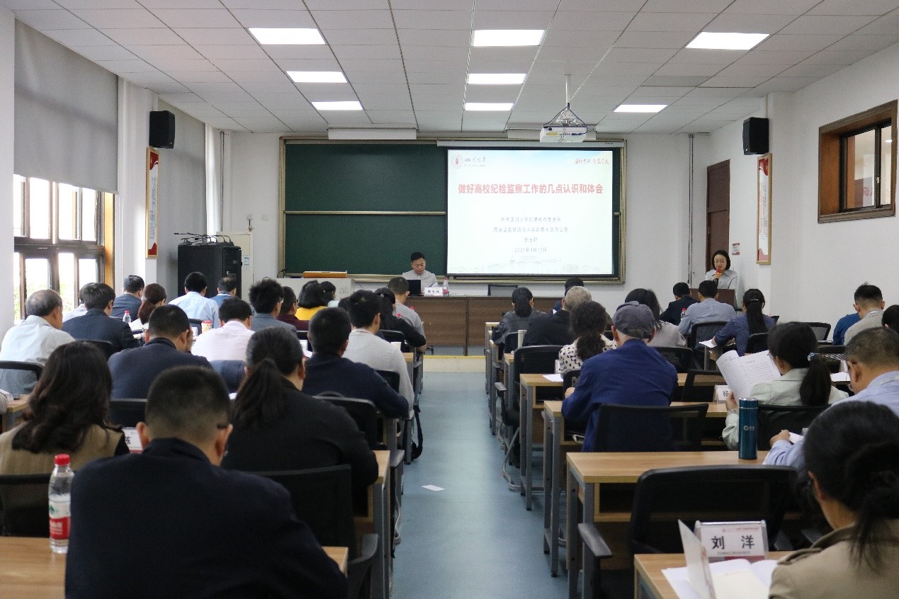 校纪委副书记、三级高级监察官李玉峰以《做好高校纪检监察工作的几点认识和体会》为题,介绍了纪委的基本职能职责和主要任务,厘清了一些认识误区,从形势任务怎么看、高校纪检怎么办、二级纪委怎么干三个方面,结合自己工作经历和学校纪检监察工作实践,为全体受训学员生动讲解了当前纪检监察工作的形势与任务,高校纪检工作的特点难点,传授了学校二级纪委履职的理念、方式和方法。