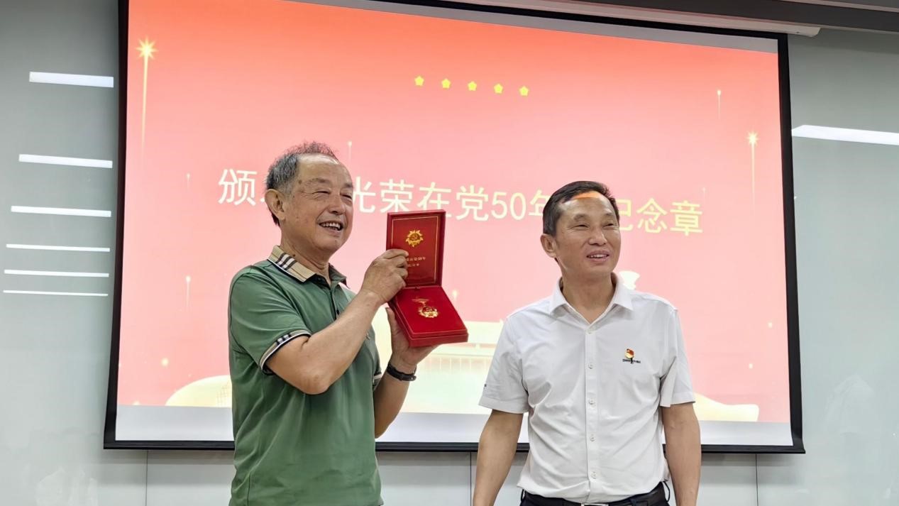 李天富书记为“光荣在党50年”老党员廖隆理同志颁发了纪念章,向他多年来为党的事业无私奉献致以崇高敬意。